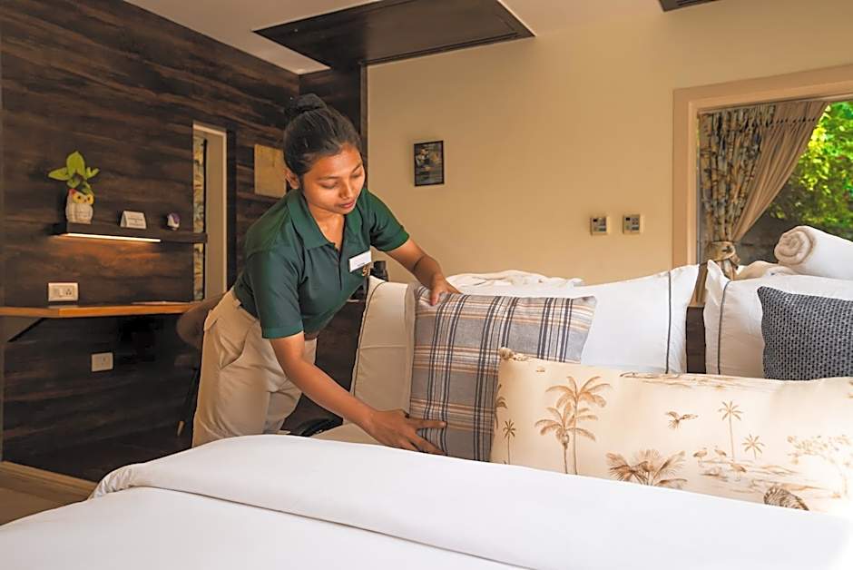 Additional benefits include: • Welcome drink on arrival (nonalcoholic) • Tea/Coffee maker with variety of Tea & Coffee flavors from various regions of India • Mini Bar consisting of variety of chocolates, snacks, aerated drinks and chips on both days • Complimentary Fruit Basket on both days • Meals as per opted meal plan • Naturally mineralized glass bottles in cottage on all days • Complimentary use of in room mini library • Barbecue snacks once during stay between 05 to 07 PM (Chefs Special) • Dedicated Service Assistant • Private theme dining in Presidential Lounge once during stay • Guided trekking trip to The Solluna Waterfall once during stay • Guided Nature Walk along river side once during stay • Guided Village Excursion once during stay once during stay • Complimentary use of Rain Dance Arena • Complimentary use of Swimming Pool (Proper swim wear mandatory) • All in & out house games (Swings, bicycling, Volley Ball, Basket Ball, Cricket, Badminton, T.T, Carom etc) • Wildlife Movies Show